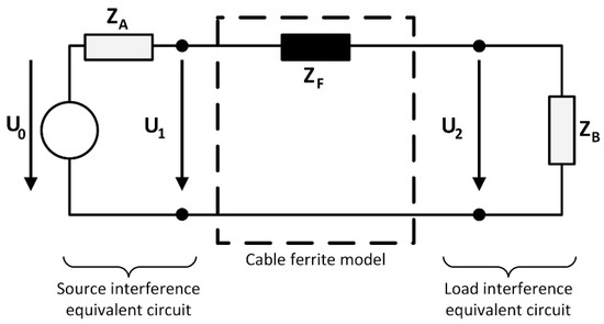The datasheets of sleeve ferrite core components generally only specify the impedance at several frequency points or the graph of the magnitude of the impedance in the frequency range where it is more effective. In contrast to this fact, other kind of EMC component datasheets, such as common-mode-chokes, show the attenuation ratio or insertion loss in terms of decibels (dB) that are able to provide. This is because the insertion loss that a sleeve ferrite core is able to yield is strongly dependent on the impedance of the system in which it is placed besides its own impedance response. Subsequently, the equivalent circuit approach to determine the insertion loss parameter of a certain sleeve ferrite core, has to consider the source impedance (ZA) and the load impedance (ZB) of the system with electromagnetic interference problems, as well as the impedance introduced by the ferrite core in that system (ZF) [27]. The equivalent circuit diagram employed to determine this impedances relation and analyze the effect of introducing a sleeve ferrite core into a certain system is shown in Figure 10.
