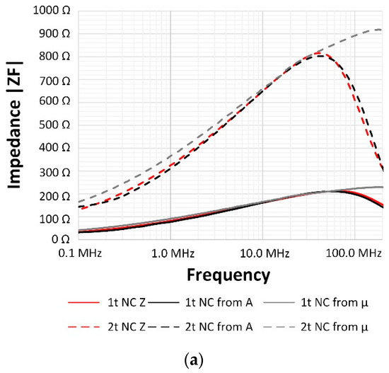 The impedance traces obtained by winding two turns into the sleeve ferrite cores are shown in Figure 8. The increase of the number of turns generates higher values of the impedance magnitude in the three traces and causes a shift in the cross points of different sleeve ferrite traces. Therefore, NC provides the best performance up to 0.76 MHz, as well as in the frequency region from 2.75 MHz to 68.10 MHz. If the 10 MHz frequency point is taken as a reference, the values of the three traces have been increased about four times (the number of turns squared). Specifically, in the case of NC from 159.9 Ω to 651.2 Ω, MnZn 55.3 Ω to 227.0 Ω and NiZn cable ferrite from 100.9 Ω to 415.9 Ω.