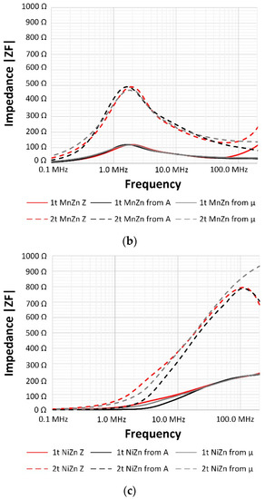 There is also a capacitance component that represents the dielectric effects of the ferrite magnetic material. This appears in the bandwidth above the , where the inductive component of the permeability becomes negative [13,37]. As can be observed in Figure 3, this stray capacitance due to the magnetic material is noted beyond 1.8 MHz and 85.1 MHz and 282.7 MHz in case of MnZn, NC and NiZn cores, respectively.