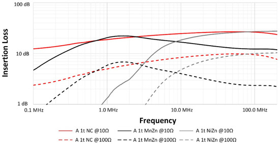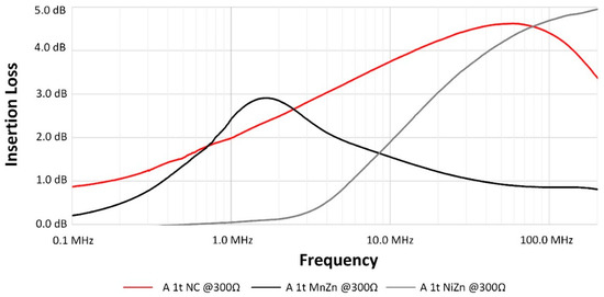 Comparison of the experimental insertion loss determined for NC, MnZn and NiZn sleeve ferrite cores by winding one turn.