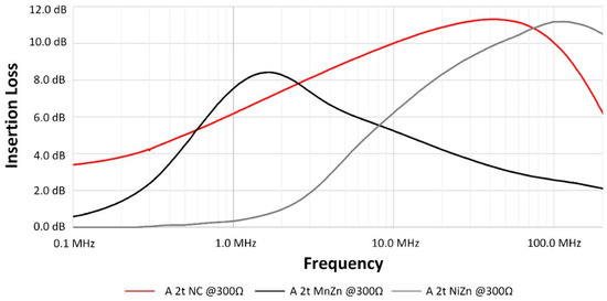 Comparison of the experimental insertion loss determined for NC, MnZn and NiZn sleeve ferrite cores by winding two turns.