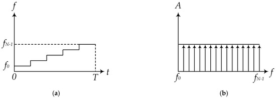 The time-frequency signal shown in Figure 1a represents a typical transmitted SF signal. The SF signal is composed of a sequence of pulses with different frequencies separated by a fixed spectral interval. The frequency of the signal varies by step in time, while generating an even spectral power distribution, as illustrated in Figure 1b. The transmitted SF signal S(f) can be described as the sum for a series of impulse functions:
