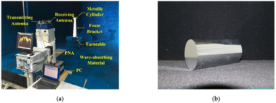 Experiments were carried out in a chamber equipped with absorbing material designed for THz operation. The absorption coefficient of the material at 200~500 GHz reached −36 dB, which could effectively suppress background noise and reduce the influence of multi-path interference such as the reflection wave from the wall and ground. In the experiment, the radar system was placed on a platform and the antennas were allocated side by side with a 5 cm gap between their front ends. This configuration could effectively suppress the influence of the direct leakage signal between the transmitter and the receiver. The target was placed on a foam bracket fixed on the turntable and it was 3.30 m away from the center of the antennas. The distance was much larger than the gap mentioned above, so the measurement system could be regarded as a mono-static system. In addition, the model center and the antenna center were on the same height and in the same vertical plane. With this experimental configuration, the dimension of the quiet zone was estimated as 30–40 cm in diameter, which was sufficiently large enough to cover the under-measurement target. The configuration of the measurement system and the metal cylinder are presented in Figure 6a,b.
