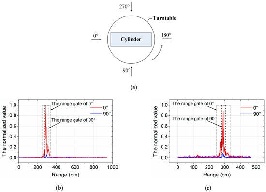 As demonstrated, the distribution of the scattering zone in the range profile was dependent on the azimuthal angle. This was caused by the variation in the radial projection dimension of the target. At 0°, the radial projection dimension corresponded to the height of the cylinder, while at angle 90° the radial projection was relevant to the diameter of the cylinder.