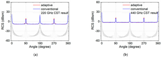 In addition, the measurement results were compared with electromagnetism-simulated RCS values, calculated by the commercial software CST, denoted by the dash lines in Figure 9. The simulation results were computed by the asymptotic solver, based on the shooting and bouncing rays (SBR) technique in the frequency domain. The solver is typically designed for efficient scattering calculation of electrically very large objects, while the contribution edge diffractions are still considered. The simulation results were first compared with theoretical RCS values of standard objects including metallic spheres, plates, cylinders, etc. Good agreements were met, confirming the reliability of the numerical calculation [21]. Compared to the calculated results, the RCS measurement errors—corresponding to the side faces—were significantly reduced by applying the adaptive range gates (2.58 dBsm at 220 GHz and 1.82 dBsm at 440 GHz), owing to the suppressed influence of the clutter. Although the absolute SNRs of the two spectra were different due to the difference in transmission power, an improvement in signal quality and measurement accuracy in both spectra were observed. This suggested an improvement in the SNR by applying the adaptive range gate method.