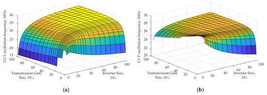 Figure 10 shows the dependency of the CUT’s oscillation frequency on the transistor’s size of transmission gate and inverter in the case of Sallen-Key (Figure 10a), Akerberg-Mossberg (Figure 10b) and Tow-Thomas (Figure 10c) filters. It can be seen, in the case of Sallen-Key LPF, when the size of the inverter was minimal (MIV = 1) and the size of the transmission gates was MTG = 18, CUT’s oscillation frequency was at a minimum and equal to 18.27 MHz, while the maximum oscillation frequency was observed when MIV = MTG = 100 and was equal to 37.85 MHz. In the case of the Akerberg-Mossberg filter, the minimum oscillation frequency was observed when MIV = 6, MTG = 44 and was equal to 26.17 MHz, while in the case of the Tow-Thomas filter, the minimum oscillation frequency was 28.32 MHz when MIV = 4, MTG = 76. The maximum oscillation frequency of the Akerberg-Mossberg and Tow-Thomas filters occurred when MIV = 12, MTG = 6 and was equal to 28.57 MHz and 27.18 MHz respectively. Further increases of the transmission gate and inverter size decreased the oscillation frequency linearly since the CUT load increased [33].