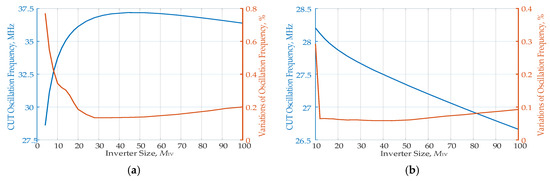 Figure 12 shows CUT’s oscillation frequency and variations of the oscillation frequency using different sizes of the transmission gate, when the size of inverter was MIV = 28. Monte Carlo simulations were repeated by changing the size of the feedback inverter from MTG = 2 to MTG = 100. It can be seen that the variations of oscillation frequency were lowest when the size of the transmission gates was MTG = 16—it ranged from 0.08% in the case of Akerberg-Mossberg (Figure 12b) and Tow-Thomas (Figure 12c) LPF to 0.13% in the case of Sallen-Key (Figure 12a) LPF. Further increases to the size of the inverter or transmission gate did not reduce the variations of the CUT’s oscillation frequency. Thus, the size of the inverter equal to MIV = 28 and the size of the transmission gate equal to MTG = 16 was the optimum point in regard to used chip area and frequency variations.