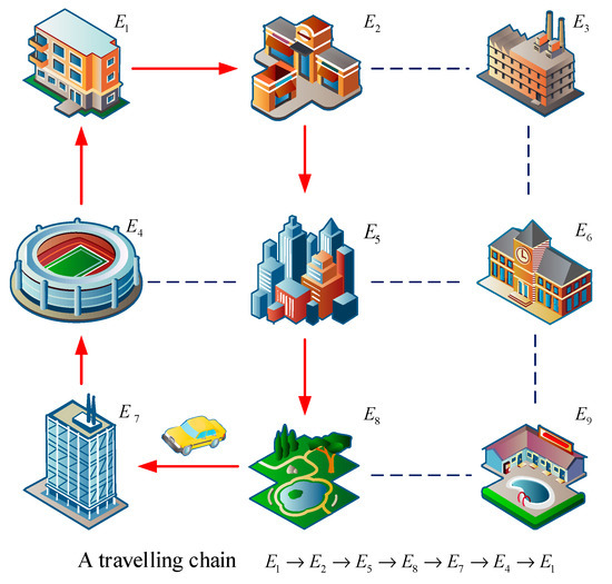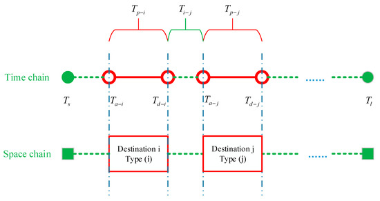 Figure 3 is a corresponding schematic diagram of a travel chain, where the broken line indicates the running process, the solid line indicates the parking process, the solid point indicates the start and end time of the day’s travel, and the hollow point indicates the arrival and departure time of each place. , are the moments of arrival at the destinations and , respectively; , are the moments of leaving the destinations and , respectively; , are the parking times for the destinations and , respectively; , are the first and last travel times of the day, respectively; and is the travel time from destination to destination .