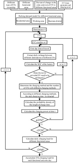 Firstly, the forecast area is divided into blocks and functional lands, such as residential, office, and entertainment areas. When the vehicle reaches a certain function land, I, it is judged whether it is charged according to the state of charge of the battery. When determining to charge, firstly, the charging mode to be used is determined, and then, according to different charging methods, the initial charging time of the vehicle is extracted. After this, the number of EVs charged by different charging methods is accumulated, and the proportion of different charging methods is determined by numerical calculation. Finally, the Monte Carlo simulation is used to calculate the overall charging load of different functional areas in the predicted area for one day. The simulation flow is shown in Figure 4.