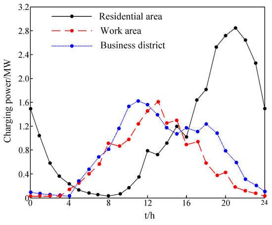 (1) Comparison of charging load in different functional areas. Due to the different nature of land used in different functional areas, the spatial distribution and charging time of EVs are different. It can be seen from the analysis of Figure 5, Figure 6 and Figure 7 that the charging loads of different functional sites differ greatly, and the peak load and peak time are also different. The residential area mainly satisfies the nighttime charging behavior of private car owners. Therefore, the peak load occurs from 19:00 to 24:00. The charging load in the work area is mainly concentrated in the working hours of 10:00–16:00, while the charging load in the commercial area is mainly concentrated in the working hours of 8:00–20:00. It can be concluded that the charging load is closely related to the spatial position.