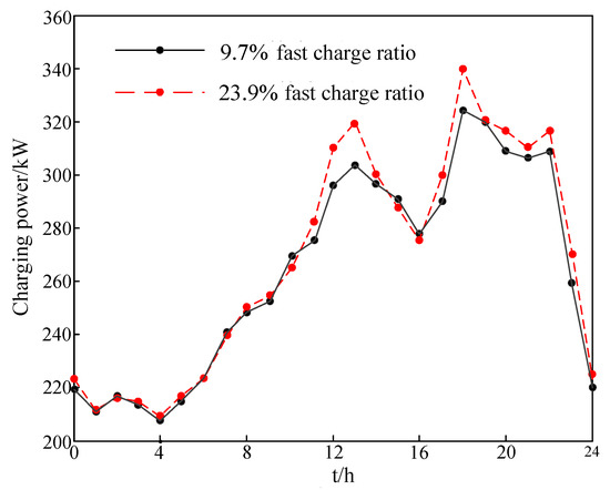 (2) Comparison of charging load under different charging modes. According to the parameters of the two main models given in this chapter, the quick charge ratio is 0.239 when the model with a smaller battery capacity is selected. As the battery capacity increases, the fast charge ratio decreases to 0.097, which results in different fast charge ratios. The load curve is shown in Figure 5. It can be seen from Figure 6 that when the fast charge ratio is 23.9%, the peak value of the load curve increases, which has a greater impact on the power grid, increasing the pressure on the distribution network in the area. It can be seen that with the increase of the cruising range of the EV, the vehicle owner adopts the fast charge. The proportion is reduced, so that the impact of the charging load on the grid is also reduced.