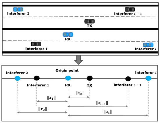 We considered a multi-lane highway scenario in which the locations of vehicles on traffic lane l were modeled as an independent PPP with intensity vehicles/km. Since the transmission range was much larger than the road width, we could safely approximate the multi-lane environment as a single-line abstraction (SLA) model [26], where all lanes are merged together into a single line (see Figure 1). Hence, we modeled the network as a 1D homogeneous PPP with the aggregate traffic intensity vehicles/km. The complete set of vehicles was independently split into transmitting and receiving nodes with probabilities and , respectively. While V2V communications followed the IEEE802.11p standard, it was shown that the CSMA protocol of IEEE802.11p exhibited operations like ALOHA in the high-density scenarios [13,18]. For the sake of simplicity of analysis, therefore, we assumed that ALOHA was the underlying MAC protocol for V2V communications. In this paper, the analysis was focused on V2V topology, the most widely-adopted type among vehicular network typologies. In other words, we assumed that each transmitting vehicle independently broadcast a safety message with probability p (hereafter, the term “transmission activity” is used to refer to p) and transmission power . It is required that each receiving vehicle correctly decodes the safety message declared by its nearest transmitting vehicle. We employed the standard power-law as the path-loss propagation model that is expressed by Frii’s formula where x is the distance between the transmitter and receiver, y is the signal wavelength, and is the path-loss exponent. The channel fading was assumed to follow a Rayleigh distribution with a unit mean power gain. Channel gains were assumed to be independent and identically distributed (IID) random variables. An interference-limited scenario was assumed, and hence, thermal noise was neglected. We also ignored the mobility effects since the transmission rate was much higher than the speed of the vehicles [27]. Furthermore, on highways, the relative velocity is quite small, and hence, we assumed a fixed topology for a sufficiently long time period.