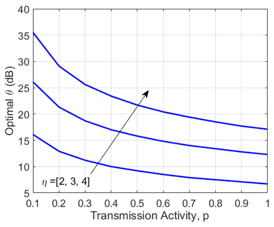 Substituting the objective function of (6) in (7), the optimal that maximized was obtained through (8). From (8), it was clear that the optimal was a function of the transmission activity p and the path-loss coefficient , while was independent of .