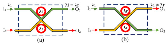 In this section, we briefly review the basics of the 2 × 2 optical switching element used in the design of an optical switch/router, the transfer matrix-based mathematical model of 2 × 2 basic OSE, and the non-blocking properties of optical switch/routers. MR is widely used as a basic component in optical interconnects due to its compact size and compatibility with CMOS. The functionality of 2 × 2 MR based OSE is illustrated in Figure 1a,b, where 2 × 2 OSE consists of two crossing waveguides and two MRs [19,38]. When the resonant frequency of MR is not the same as the modulated signal, the optical signal simply passes through the waveguide intersection. However, when the wavelength, i.e., λi = λr, the optical signal gets coupled into MR and changes its direction to its respective output [39,40] where λi is the input wavelength while λr is the wavelength of the particular MR, as shown in Figure 1. It consists of two states (1) active state, i.e., drop/bar, and (2) inactive state, i.e., through/cross. In the active state, MRs are in a resonance condition with respective inputs, therefore, input signals I1 and I2 get coupled into upper and lower MRs, respectively, and as a result, I1 and I2 are propagated to O1 and O2, respectively, as shown in Figure 1a. During the inactive state, input signals I1 and I2 pass through using the same waveguide and are transmitted to O2 and O1 as shown in Figure 1b [19]. Detailed I/O mapping of 2 × 2 OSE is shown in Table 1. In this article, we use a MR-based 2 × 2 OSE as the basic design unit for the proposed HCROS architecture and we use the terms drop (DB) and through (TC) for the active and inactive states, respectively.