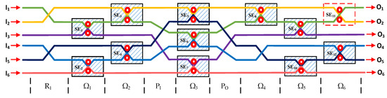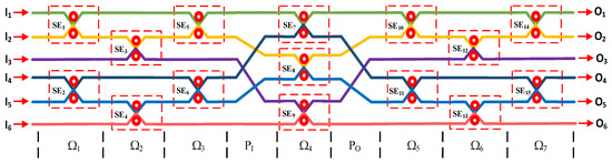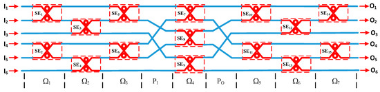 PI and PO represent stages without OSEs, these two stages are a combination of straight and crossing waveguides and are represented using Equations (7) and (8), respectively. PI is a column permutation matrix while PO is a row permutation matrix.