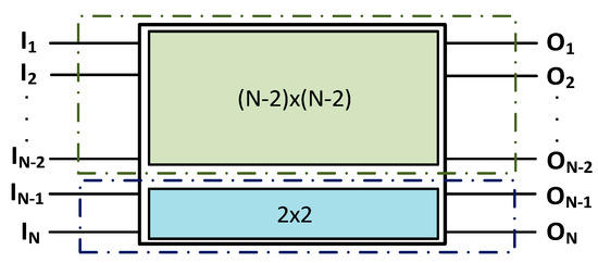 Since, we have 2 transfer matrices, i.e., 2 = 2!, therefore, for N = 2, the switch is non-blocking. Suppose, the assertion is true for (N-2) ports. This means there exists (N−2)! distinct transfer matrices for (N-2) port optical switch. To show that the assertion is true for N ports, we divide the N × N switch into two layers, one with N-2 ports and the other with 02 ports. An example of such layering is shown in Figure 6. □