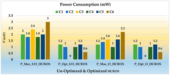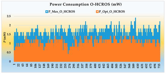 Similarly, for optimized HCROS, the results of the optimal switching combination show a noteworthy improvement in power consumption POpt_O_HCROS as compared to PMax_O_HCROS. The results of all 720 I/O permutations are shown in Figure 13. It can be observed that in some cases, PMax_O_HCROS equals POpt_O_HCROS; this is because the fact maximum and optimal switching combinations of OSEs are equal, hence the same power is consumed in both cases. However, PMax_O_HCROS never crossed the POpt_O_HCROS, out of 720 I/O permutations 106 I/O permutations have the same power consumption, i.e., PMax_O_HCROS equals POpt_O_HCROS. In other words, we can conclude that 85% of the time, POpt_O_HCROS leads to minimum power consumption and 15% of the time, PMax_O_HCROS equals POpt_O_HCROS in optimized HCROS.