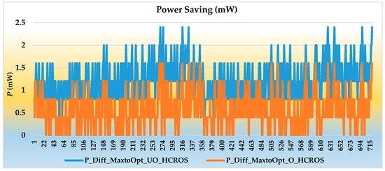 Finally, overall power savings for all 720 I/O links are shown in Figure 14. The difference between PMax_UO_HCROS and POpt_UO_HCROS is calculated and shown in blue, while the difference between PMax_O_HCROS and POpt_O_HCROS is presented in orange. A maximum power saving of 2.4 mW and 1.6 mW is reported in un-optimized and optimized HCROS, respectively, as a result of optimized reconfiguration.