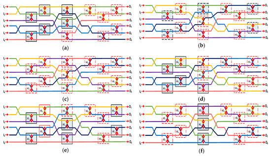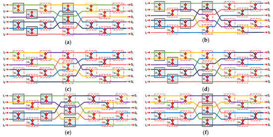 Using algorithm-1, we can find more than one optimal switching combinations for one I/O link, so the appropriate combination can be selected and HCROS can be reconfigured according to the design requirements. Based on the results of Table 6, we chose one of the optimal switching combinations from each I/O links and this is shown in pictorial form for un-optimized HCROS architecture in Figure 15a–f, which is especially helpful in analyzing the effect of insertion loss of the proposed HCROS in both optimal un-optimized and optimized forms.