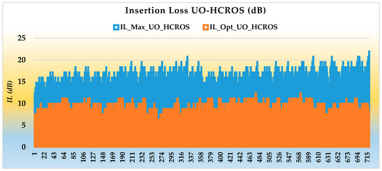 Insertion loss ILMax_UO_HCROS and ILOpt_UO_HCROS for all 720 I/O links in un-optimized HCROS.