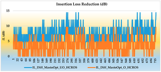 The reduction in insertion loss for all 720 I/O links is shown in Figure 21. The difference between ILMax_UO_HCROS and ILOpt_UO_HCROS was calculated and is shown in blue, while the difference between ILMax_O_HCROS and ILOpt_O_HCROS is presented in orange in Figure 21. A maximum reduction of 14.4 dB and 9.6 dB insertion loss can be seen as a result of the optimized reconfiguration, in un-optimized and optimized HCROS, respectively.