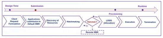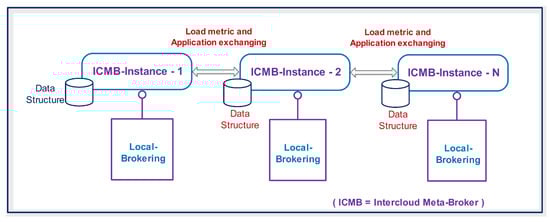 Brokerage architecture for the formation of the Intercloud federation comprises various topologies, e.g., centralized, decentralized, and hierarchical [,,]. A centralized scheme is a single meta-scheduler- or broker-centric where all clouds are controlled through a core component []. It also allows the interface to submit application requests for various computing resources treated as middleware between users and service providers. In a decentralized approach, brokering components are distributed that represent their associated cloud, and realize a federation by inter-broker communication. Collaboration among these components also facilitates a discovery process in a seamless manner. Moreover, in this scheme, user requests are submitted to each meta-broker, where, after analyzing the states of resources of each service provider, requests are diverted to more optimal datacenters through their respective local-brokers. Local-brokers have ownership of the resources of datacenters, and perform actual allocation by using various algorithms. Therefore, local-brokers maintain constant interaction with meta-brokers as resource use and availability changes dynamically. Hence, in view of highly dynamic scenarios, meta-brokering components cannot make prior decisions without receiving updates on the consumption state resources.