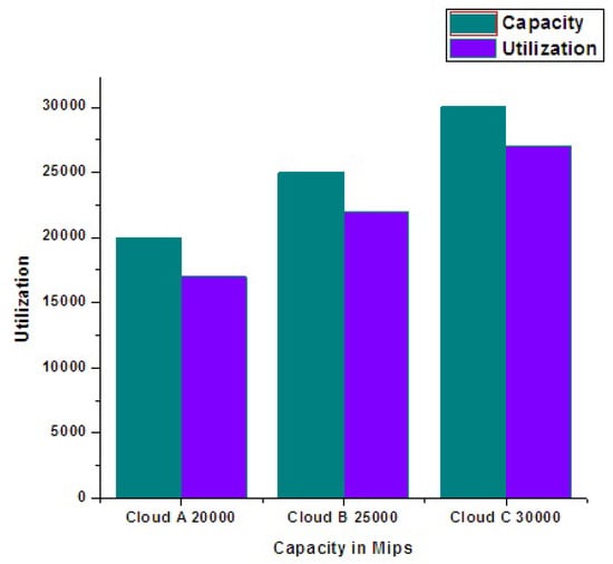 Experimental analysis of the application burst is depicted in Figure 12, which indicates that after reaching a certain range of particular cloud Mips (e.g., after consumption of available capacity), user applications are being burst into other participated sites. This factor is achieved based on data structure information. This information is obtained through underlying monitoring modules and facilitates dynamic brokerage and scaling of the workload accordingly. Figure 13 depicts the waiting time of the user applications in both the scaling and non-scaling mode. In the scaling mode, the waiting time of the application is significantly decreased because of adequate availability of resource in the form of joint clouds.