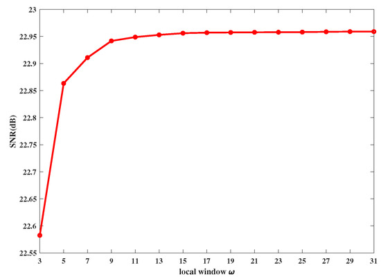 The size of local window is a factor that may influence the noise removal effect of SAHOCTVL1 model. In [33], the author illustrated through experiments that it can reduce more noise and recover more details when . Here, we also make an experiment. We choose camera as test image, and add 30% salt-and-pepper noise. When varying from 3 to 31, the SNR of the restored image is shown in Figure 6. From Figure 6, generally speaking, SNR does not change much, and when , SNR tends to be stable. Therefore, in this paper, we still set and the other parameters are the same as mentioned before.