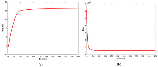 It can be seen that the SNR value (or the function ) increases (or decreases) monotonically, which can demonstrate the convexity of the model. Besides, it can be seen that after 130th iteration, the SNR values keep stable, and the function remains unchanged after 70th iteration, which means that the model has converged to an optimal solution.