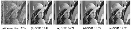 For the sake of testing the performance of HOCTVL1 model in removing random-valued noise, we also carry out a series of experiments. Figure 12 and Figure 13 show the visual comparisons of Lena image corrupted by Gaussian blur and random-valued with noise levels 30% and 50%. It can be seen that for noise level 30%, both four models can effectively restore the corrupted image, but the image restored by TVL1 is still somewhat blurred, the images recovered by other three models are clearer and the recovered image by HOCTVL1 model is closer to the original image and its SNR is the highest. For noise level 50%, there is a little noise in Figure 13b,c, which shows that TVL1 and HTVL1 models cannot completely remove the 50% random-valued noise though HTVL1 model has a better performance. While CTVL1 model and HOCTVL1 model can remove noise very well, and the recovered image by HOCTVL1 model is clearer than that by CTVL1 model, which illustrates that high-order regularizer term can effectively restrain the staircase effects. Meanwhile, the value of SNR of HOCTVL1 model also illustrates this point.