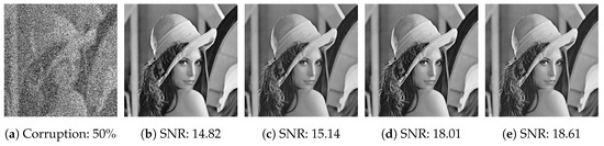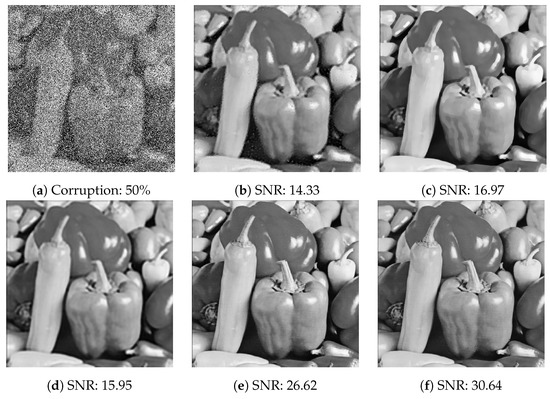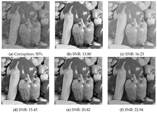 Firstly, we show the visual results of the pepper image corrupted by salt-and-pepper noise and random-valued noise with noise level 50% respectively, as are shown in Figure 17 and Figure 18.