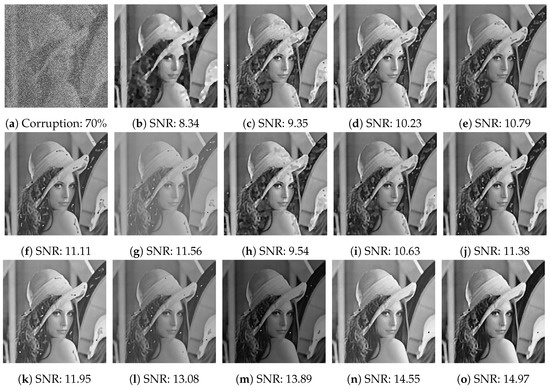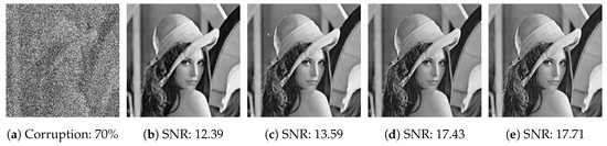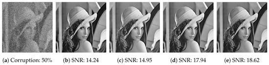 - Ming, Y. Restoration of Images Corrupted by Impulse Noise and Mixed Gaussian Impulse Noise using Blind Inpainting. SIAM J. Imaging Sci. 2013, 6, 1227–1245. [Google Scholar]