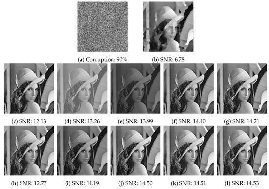However, TVL1 model has its own shortcomings, which makes it ineffective in dealing with high-level noise, such as 90% salt-and-pepper noise and 70% random-valued noise [21]. In recent years, a large number of scholars have devoted themselves to this research, and a lot of algorithms have been proposed [22,23,24,25,26,27]. In 2009, Cai et al. [22] proposed a two-phase method, and in the first phase, damaged pixels of the contaminated image were explored, then in the second phase, undamaged pixels were used to restore images. Numerical experiments show that the two-phase method is superior to TVL1 model, it can handle as high as 90% salt-and-pepper noise, and as high as 55% random-valued noise, while it cannot perform effectively when the level of random-valued noise is higher than 55%. Similarly, considering the problem that TVL1 model may deviate from the data-acquisition model and the prior model, especially for high levels of noise, Bai et al. [23] introduced an adaptive correction procedure in TVL1 model and proposed a new model called the corrected TVL1 (CTVL1) model. The main idea is to improve the sparsity of the TVL1 model by introducing an adaptive correction procedure. The CTVL1 method also uses two steps to restore the corrupted image, the first step generates an initial estimator by solving the TVL1 model, and the second step generates a higher accuracy recovery from the initial estimator which is generated by TVL1 model. Meanwhile, for higher salt-and-pepper noise and higher random-valued noise, by repeating the correction step for several times, high levels of noise can be removed very well. Numerical experiments show that the CTVL1 model can remove salt-and-pepper noise as high as 90%, and remove random-valued noise as high as 70%, which is superior to the two-phase method.
