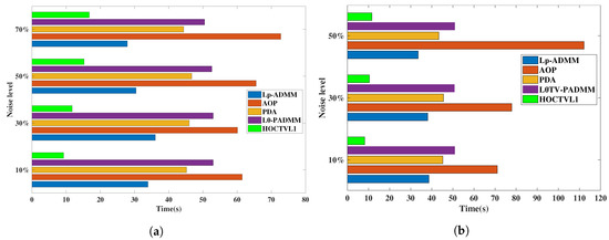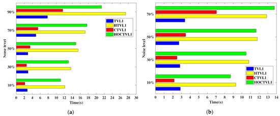 Figure 19 shows the running time of the five methods for restoring the corrupted pepper image. When dealing with 90% salt-and-pepper noise and 70% random-valued noise, HOCTVL1 model needs multi-correction steps, which costs a lot time, here we only show the time of removing salt-and-pepper noise as high as 70% and random-valued noise as high as 50%. It can be seen that compared to other four methods, our HOCTVL1 model spends the least time whatever the noise level is. It can also be found that the other four methods take several times as much time as our model, which illustrates the advantages of our model.