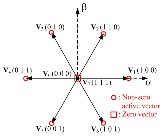 Figure 2 shows the eight voltage vectors that can be produced by VSIs. VSI can control the output currents by using voltage vectors [10,12]. The binary values of “0” and “1” in the switching functions indicate the open and closed states, respectively. Using the space-vector definition, the load current can be denoted as