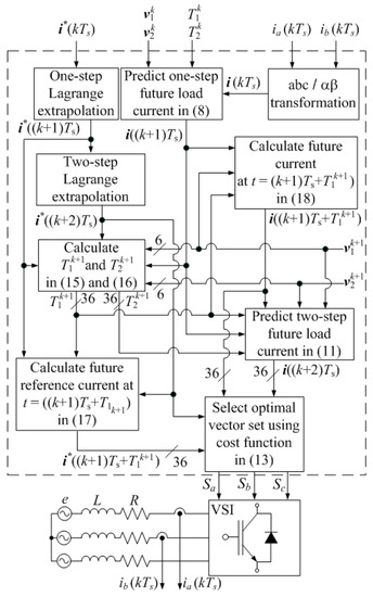 After evaluating 36 possible voltage vector sets and the time distribution to minimize the cost function, one optimal future non-zero active set and their optimal durations can be selected. The two future active vectors, and , selected in the proposed scheme, are attained during the pre-selected durations and in the future sampling period. Examples of the output-current behaviors determined by voltage vectors generated by the proposed algorithm are shown in Figure 3. As shown in Figure 3, the final value of the output current depends on the voltage vector to be selected and the time intervals to be divided. The control block of the proposed algorithm is shown in Figure 4. The optimal control process for the proposed algorithm at the sampling period is attained with the following steps: