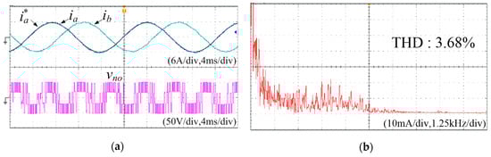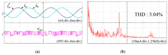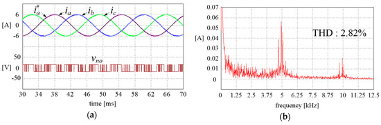 Experimental results of the proposed algorithm with = 200 μs: (a) the output currents (, , and ), a phase reference (), and CM voltage () (b) FFT spectrum of the a phase output current (= 6 A and = 100 V).