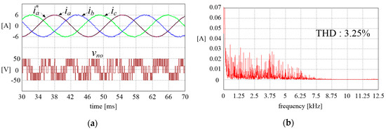 Simulation results acquired from the proposed algorithm with = 200 μs: (a) the three-phase output currents (, , and ), a phase reference (), and CM voltage () (b) Fourier transform (FFT) spectrum of the a aphase output current.