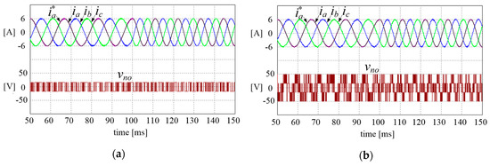 Three-phase voltage-source inverters (VSIs) have been used commonly to generate three-phase line currents, while the frequencies and amplitude of the three-phase line currents are changeable [1,2]. In VSIs, the fast switching operation results in common-mode (CM) voltage, which has been considered the cause of over voltage stress to surrounding electronic systems [3,4,5,6,7,8]. To alleviate the amplitude of the CM voltage, multifarious studies have been conducted with a PWM algorithm that is designed by only selecting the non-zero active vectors, and this is because the zero vectors produce the highest CM voltage [3,4,5,6,7,8]. However, when the inverter is controlled by only using the non-zero active vectors without selecting the zero vectors, the Total Harmonic Distortion (THD) and error of the output currents of the inverter inevitably deteriorate. This is because zero vectors typically produce the smallest variation in the load dynamics. Therefore, methods for reducing the CM voltage without deteriorating the inverter performance have been studied extensively [9,10,11,12,13,14,15,16]. Recently, a model predictive control (MPC) method was studied for VSIs owing to its flexibility and simplicity of control [17,18,19,20,21,22,23,24,25,26,27,28,29]. Utilizing the basic principle that VSIs can apply two zero vectors and six different non-zero active voltage vectors to the load, seven different future current behaviors, which change according to the voltage vectors, can be predicted by the MPC method. The possible future currents of the VSI can be calculated using the load dynamic model. Based on the cost function, which is predefined as the error between the reference currents and the predicted output currents, all predicted currents calculated by the seven different possible cases using the load dynamic model can be used to choose one voltage vector to minimize the predefined cost function. However, in the conventional MPC method which selects only one voltage vector during the sampling period, if only the active vector is used to reduce the CM voltage without using a zero vector which produces the highest CM voltage, the current error and current total harmonic distortion (THD) are inevitably higher than those of the method using PWM blocks. To overcome these problems, MPC methods using a double vector (DV) have been studied [8,17,18]. In this paper, there are two conventional DV-MPC algorithms, called DV-Conv1 and DV-Conv2. In the DV-Con1 method, two vectors closest to the reference are first selected, and then the sampling period is divided for minimizing the cost function [10]. In the DV-Con2 method, one vector closest to the reference vector is selected first, and the second vector is selected by dividing the sampling period to minimize the cost function [8,17,18]. However, such control methods have a disadvantage in that the calculation time is increased and if the conventional algorithm is operated with a half sampling period, selecting two vectors at one sampling period, for fair comparison, the current ripples and errors of the DV-Con1 and DV-Con2 methods are higher than those of the conventional method which selects one vector during one sampling period. Finally, the VSI using the MPC method applies the optimal voltage vector during each sampling period. Because of its simplicity, the MPC method has been used extensively to control the line current of many non-VSI converters, which are matrix converters, multiphase inverters, and multilevel inverters [19,20,21,22,23,24,25,26,27,28,29,30].