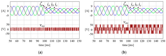 Three-phase output currents (, , and ), a phase reference output current (), and CM voltage () for a amplitude step change obtained from 9 A to 4.5 A (a) the proposed algorithm with = 200 μs (b) the conventional algorithm with = 100 μs.