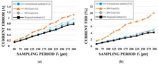where is the fundamental component of the output currents and is the nth-harmonic component in the x phase. The value of n was set to 8335 in the PSIM. Figure 9b shows that the THD of the proposed algorithm is much lower than that of the conventional algorithm using a half sampling period. The proposed algorithm also shows lower THD than the DV-Con1 and DV-Con2 methods using the same sampling period.