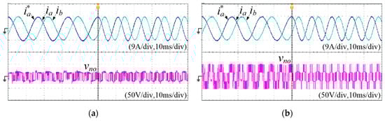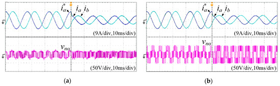 Experimental results of the output currents ( and ), a phase reference (), and the CM voltage () for a fundamental frequency step change from 60 Hz to 90 Hz for (a) the proposed algorithm with = 200 μs, (b) the conventional algorithm with = 100 μs.