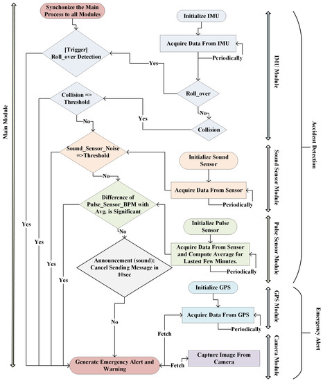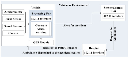 Figure 5. Proposed system architecture of automatic accident detection and notification.An incident like a road accident could either be a collision with other vehicles or any other object or a rollover. Whenever a collision happens, the speed of the vehicle decreases dramatically, and its acceleration can be measured by the accelerometer. Roll-overs can be detected by monitoring the angular position of the vehicle or by using angular velocities. The angular position of the vehicle is computed by using the data gathered from a gyroscope. In case of a roll-over, an emergency message is generated without incorporating the data from a glass break detector and pulse sensor, due to its severity; however, in case of collision, data from all the sensors are analyzed. The flowchart of the accident module is shown in Figure 6. It can be seen that all the sensors are initialized and updated at regular intervals. If the collision detection is above the predefined threshold, the emergency alert is sent to the rescue services and to the nearby vehicles. Contrary to this, if the collision detection by the IMU does not exceed the threshold value, then the system will fetch data from the sound sensor. If the sensor circuitry detects a noise greater than the threshold value, then the emergency alert is sent. If there is no noise heard by the sensor circuitry, then the system will take the data from the pulse sensor. If the heart rate is above a certain threshold, then the alert message will be sent; otherwise, an alarm is generated that is usually canceled by the driver in normal circumstances. If the driver does not turn off the alarm, it is assumed that the driver is not in a condition to do so, and again an emergency alert is sent. Location coordinates and image of the vehicle from inside are fetched from the GPS module and camera module, respectively, and then it is enclosed in the emergency message.