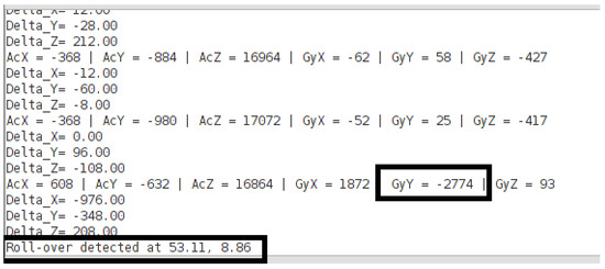 The roll-over is detected using the angular velocity. If the value of angular velocity exceeds a predefined threshold i.e., , a roll-over is detected as it is presented in Figure 8.