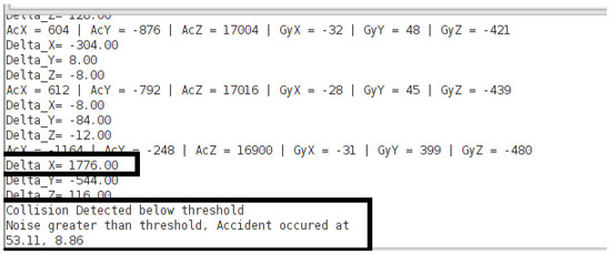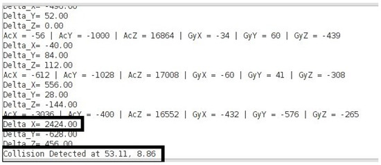 Likewise, once the change between two successive values of an accelerometer surpasses the predefined threshold i.e., , a collision event is prompted as demonstrated in Figure 9.
