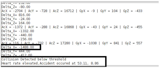 If the recorded value of a sound is less than the threshold, then it takes the readings from the pulse sensor for analysis to detect an event. Based on acquired values, if the heart rate is raised, then it considers the event of the collision to be true and the emergency alert is sent to the control room as it is depicted in Figure 11.