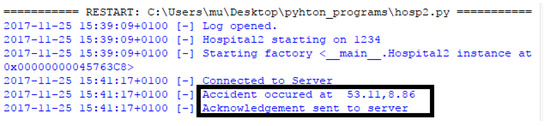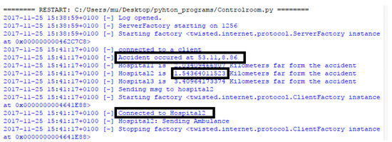 When the server receives an alert message, it excerpts the position of the road accident and finds the nearest medical center/ hospital to the location of an accident with the help of the Haversine formula. Then, it sends an emergency message to that identified hospital requesting to dispatch an ambulance along with paramedical personnel to the incident location as shown in Figure 13. To ensure the service, an acknowledgment is sent to the control room from the hospital.