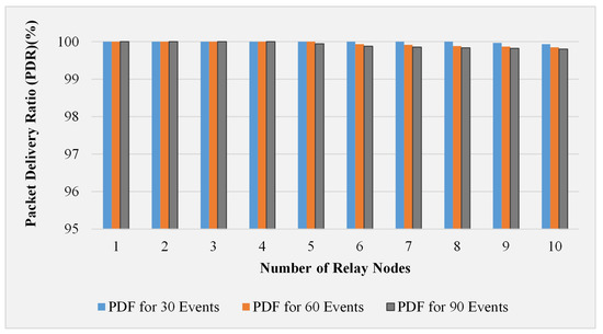 The trend of packet delivery ratio (%) with increasing relay nodes.
