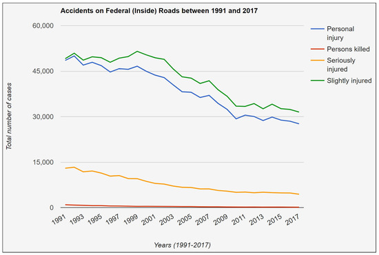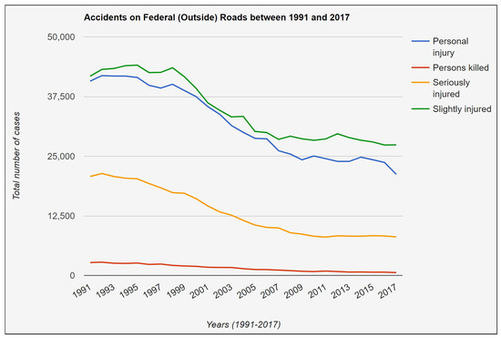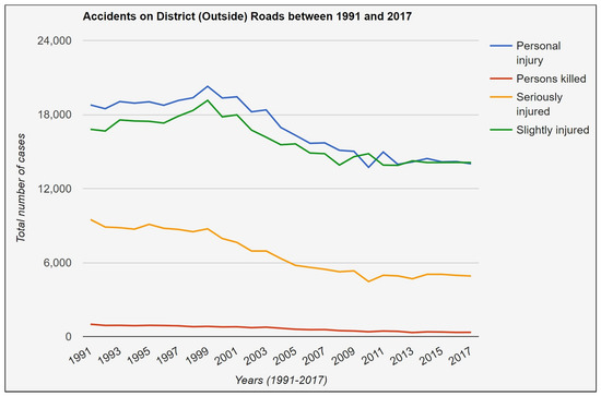 Figure 19. Levels of injuries that occurred on federal roads in small towns and rural areas (1991–2017).The recorded data on federal roads inside the build-up areas of era 1991–2017 presented in Figure 18 shows that there were 1,044,451 cases of personal injuries, among them, 1,149,046 people faced slight injuries. Similarly, the recorded data on federal roads outside the built-up areas in the same era presented in Figure 19 show that there were 858,154 cases of injuries, among them, 936,236 faced slight injuries. The difference between the numbers reverse, when the persons killed or severely wounded as a result of these accidents, are counted. There were 10,408 cases of death in the first scenario while 41,869 in other cases, which is a four-fold increase. Similarly, there were 208,959 people who faced serious injuries inside the built-up area while 357,817 were in other cases. Hence, there might be more accidents in cities or towns, but, outside of cities, these accidents are considered more dangerous due to the lack of facilities. At the same time, it is good to notice that German authorities are carrying out their duties rather effectively, and there is a stable decrease in the number of casualties and injuries over the years. - Analysis on District Roads:Figure 20 and Figure 21 present a similar scenario of road accidents’ recorded data for the years 1991–2017 on the district roads. Although the total number of casualties and injuries on district roads is much less when compared to federal roads, the drop in personal wounds or slight injuries over the last decade is not very satisfying, especially in the case of roads inside the built-up areas. For instance, on the district roads inside the built-up areas, the number of personal injuries was 16,526 in the year 2008 while 15,997 in the year 2017, which is a mere decrease of 529 cases over a decade. Similarly, the number of people who faced mild injuries was 17,788 in 2008 and 17,109 in 2017, which is again a decrease of 679 cases. Although the overall trend is positive, a sharp decrease in these figures referenced is needed, especially at this period of time, when the roads in Germany are considered to be the safest.
