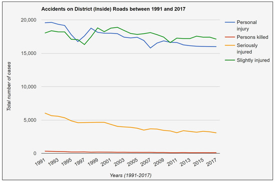 Figure 20. Levels of injuries that occurred on district roads inside the built-up areas (1991–2017).